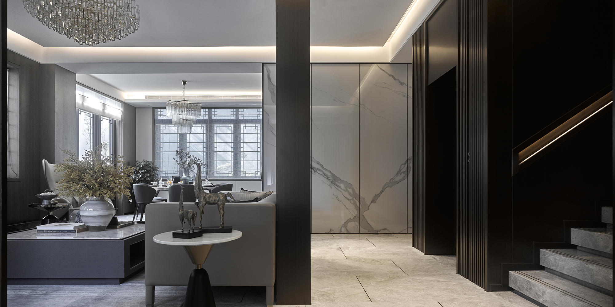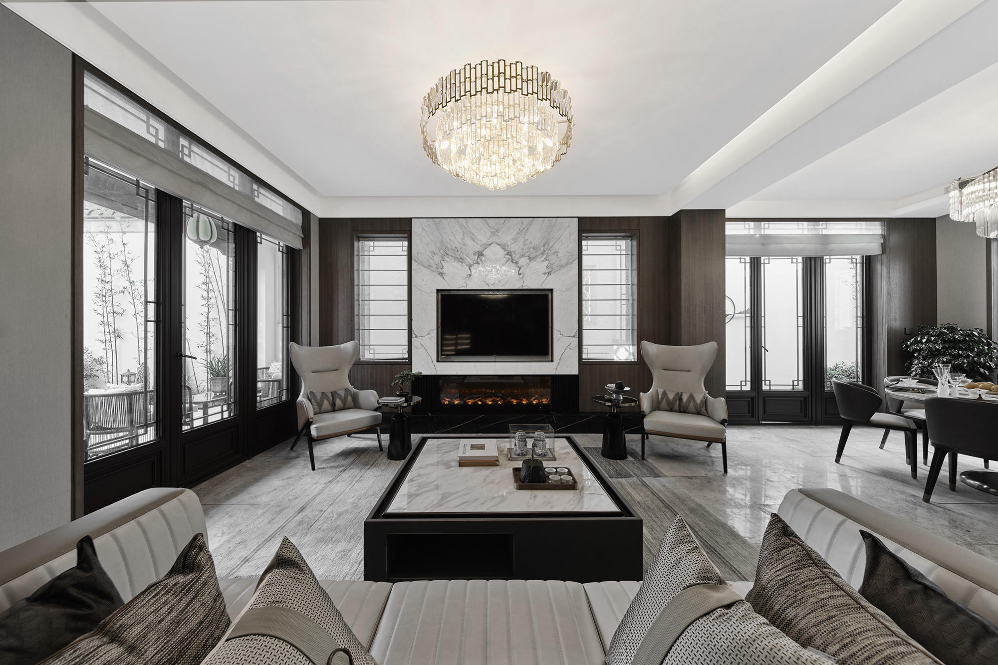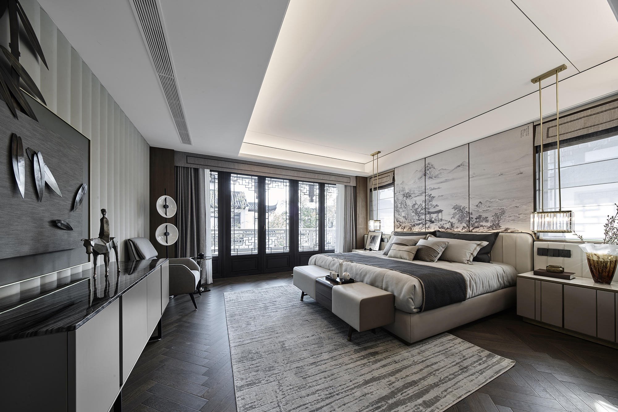 眺望富春江,背倚黄公望国家森林公园,绿城·富春玫瑰园以赋予有无相生、道法自然的东方哲思,匠心创作出遵循中式美学内涵的庭院居所,隐逸生活映现于世。