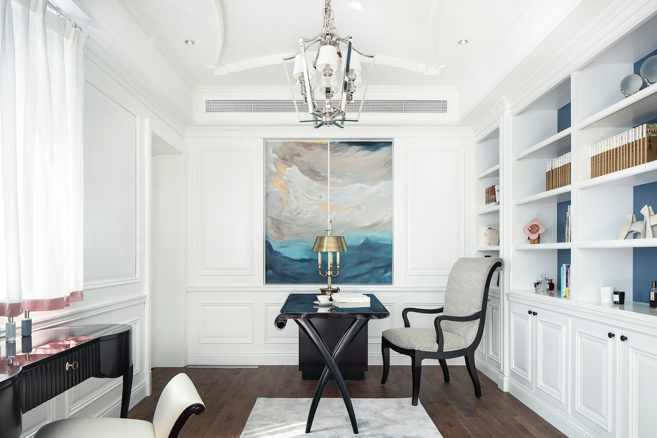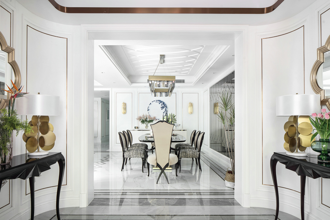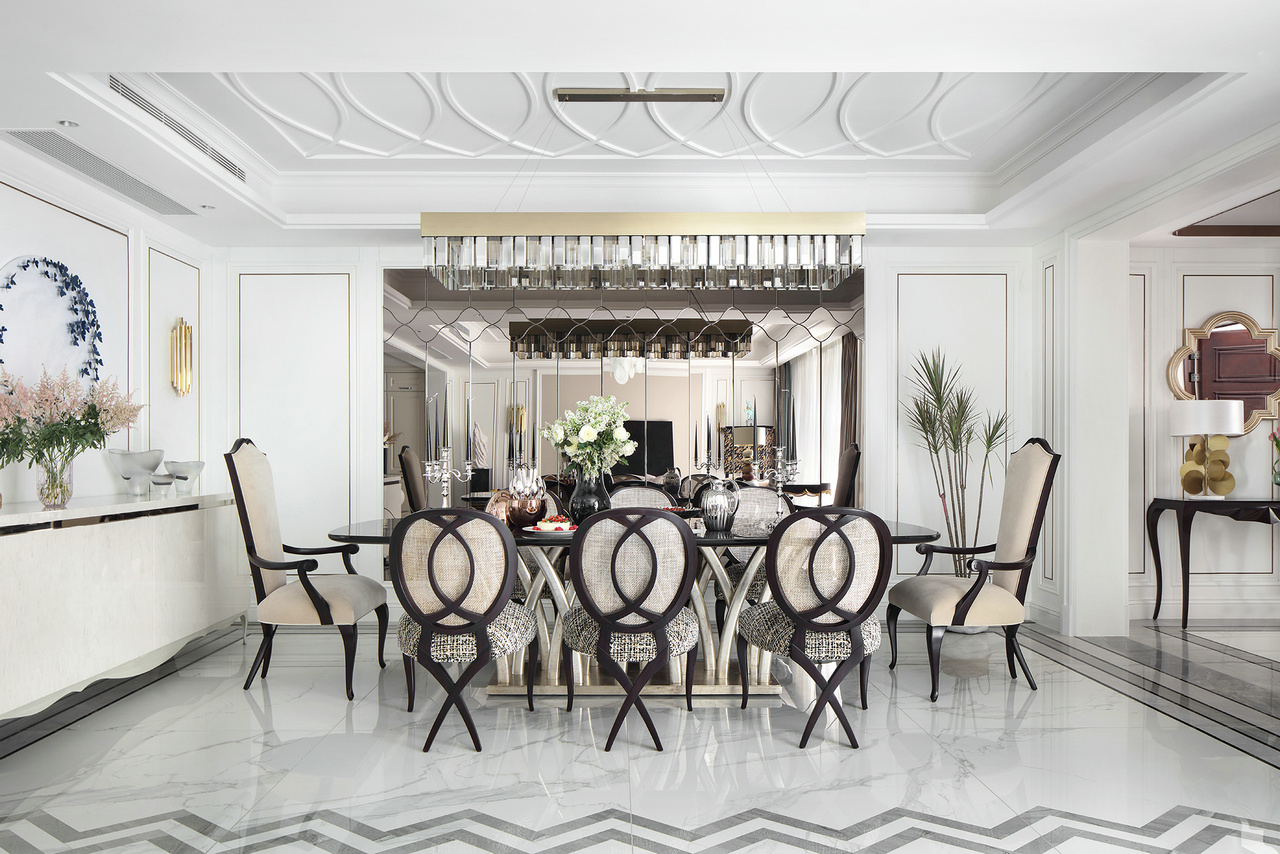 甫进玄关,对称设计的稳重感与仪式感便扑面而来,生机盎然的花束,清芬盈室,仿佛是在欢迎来访之人。 门厅、玄关与正餐厅在层层递进中,一一跃入眼帘,像一首节奏感极强的音乐,律动错落,疏密有致。客餐厅与西厨的打通,增强了家庭成员彼此间的互动性,让家中充满了爱、温暖与明朗的氛围。