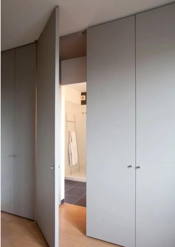 平开式隐形门(用的最多):有利用成排柜体,从柜门处进入另一空间的(常见从衣柜处进入卫生间),也有纯粹从墙面做门的,大多是选择与相邻墙体相同的材质,从而达到“隐形”于墙面的效果。
